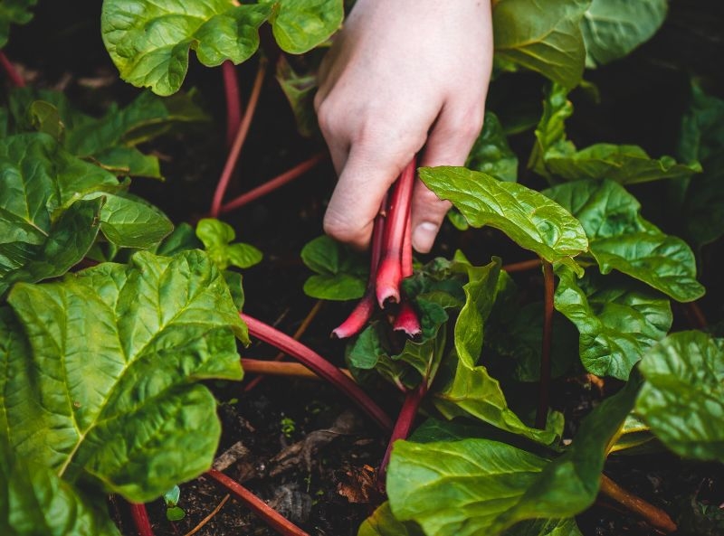 - Rhubarb: Dark green foliage with deep red stalks; seed after frost risk has passed or it may bolt.