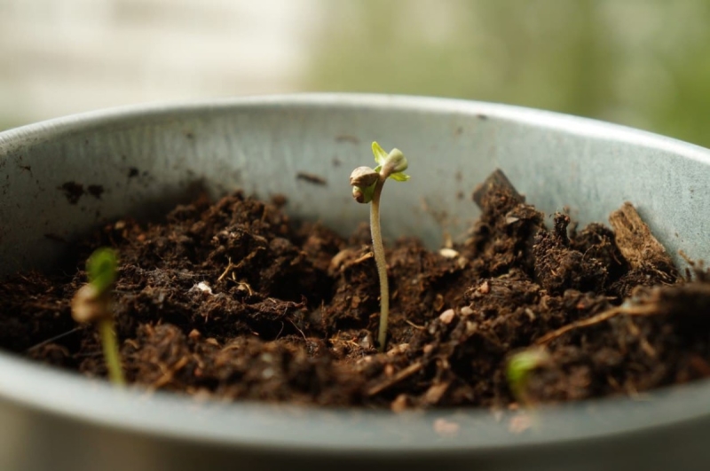 Dies ist perfekt, um junge, in Erde gepflanzte Cannabispflanzen zu verpflanzen. Sämlinge in der Mischung aus Erde, Kokosfaser und Perlit können ihr Wurzelsystem frei entwickeln.