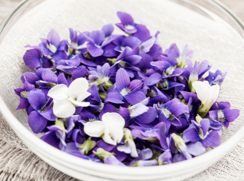 Sweet violet blooms are edible and used to flavor sugar, salt, and herb butters, or as a candied or raw adornment on sweets. The roots and leaves of the sweet violet are not harmful either. The blooms yield an aromatic oil that is used in cosmetics and perfumes. Viola odorata’s therapeutic qualities are employed in cough teas and medicinal face washes. In homeopathy, sweet violet is used to treat respiratory illnesses and wrist rheumatism.