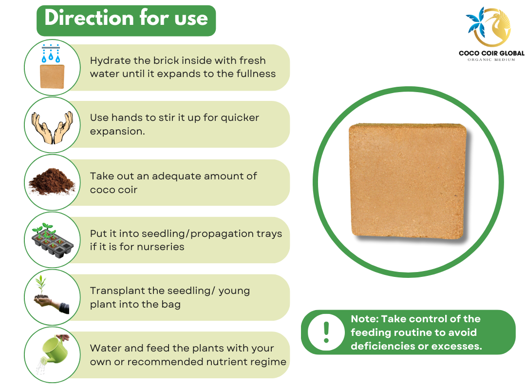 I coltivatori possono anche miscelarlo con perlite per migliorare la capacità di drenaggio dell’acqua del substrato. In alternativa, possono fornire soluzioni nutritive perché i mattoni in fibra di cocco hanno un basso contenuto di nutrienti, quindi è importante integrare i nutrienti necessari per le piante.